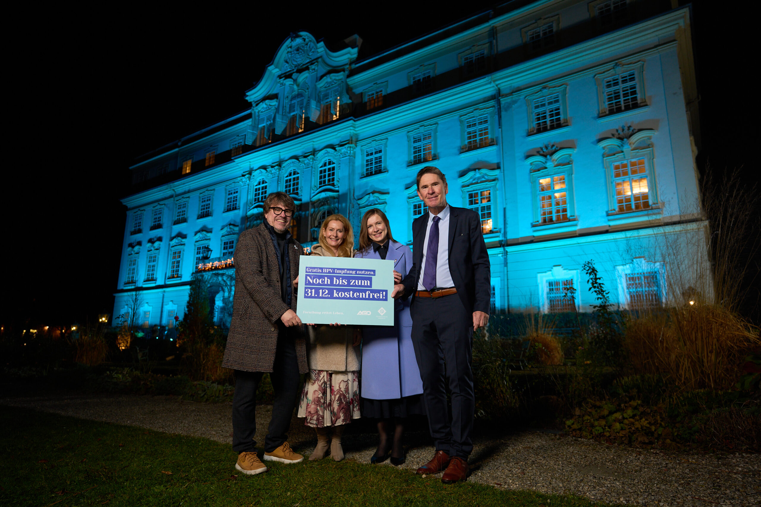 Schloss Leopoldskron in Salzburg erstrahlt in „Petrol“. Die AGO und die Krebshilfe rufen gemeinsam zur HPV-Impfung auf. Jetzt noch bis zum 31.12.2025 für alle unter 30 Jährigen kostenfrei.